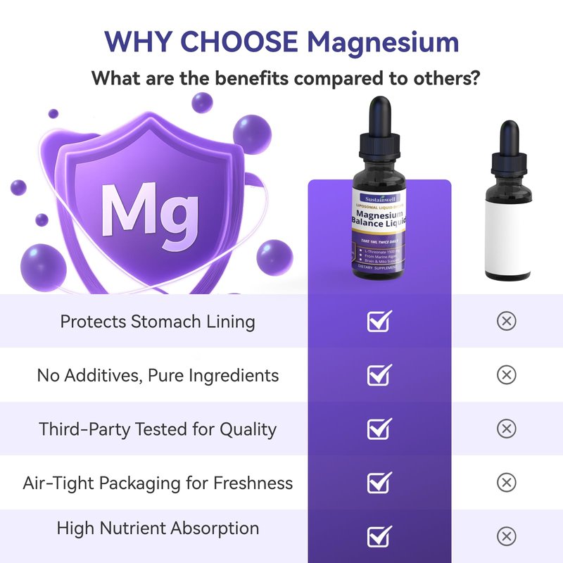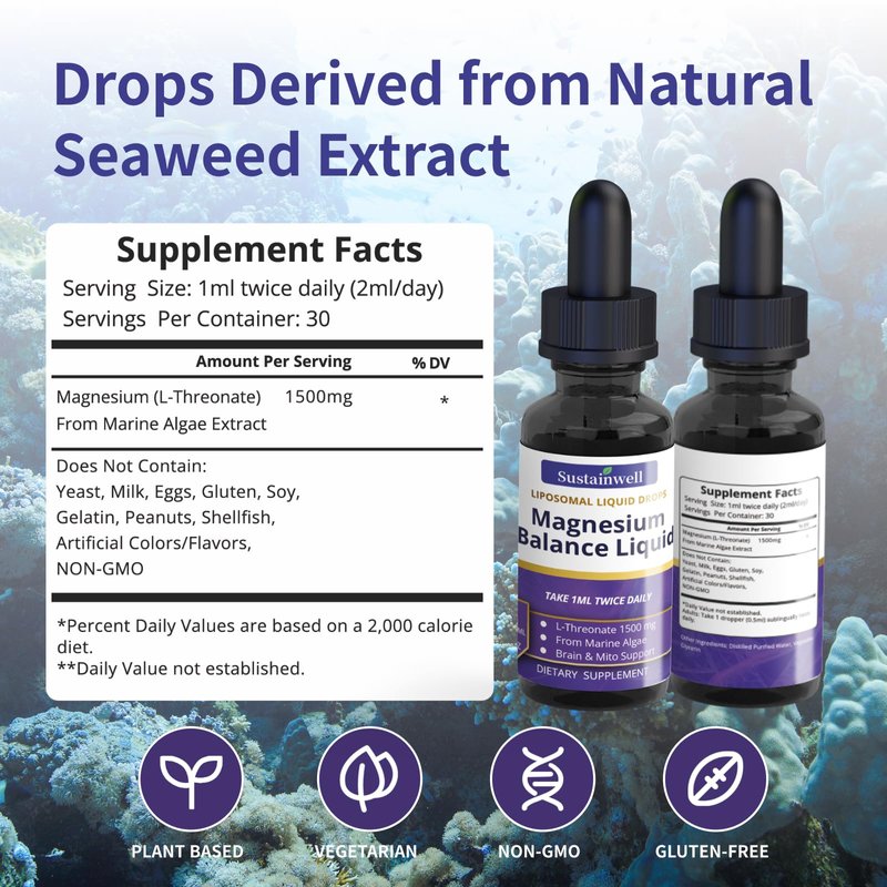 Magnesium L Threonate Liquid Drops 1500mg High Absorption Brain Supplement for Memory Focus Sleep Anxiety Relief Sugar Free Vegan 2.04 Fl Oz