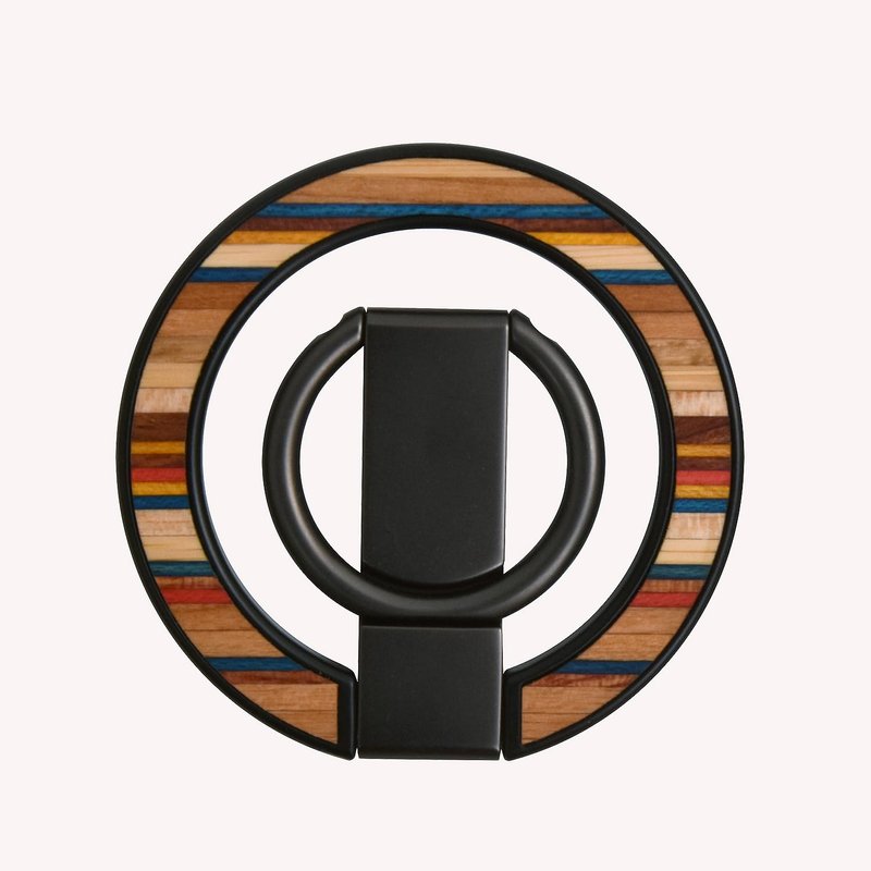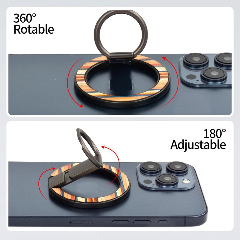 - 【High Quality Material】 - The finger ring kickstand is made of high-quality zinc alloy and 100% natural wood (walnut). Zinc alloy has good ductility and features ruggedness, which contributes to a long lifespan. Polished ring holder, smooth edge, no worries of scratches to your fingers. The surface is polished delicately, with exquisite craftsmanship. Walnut wood has different textures, making it more unique and aesthetically pleaing, giving it a more high-end and upscale appearance.