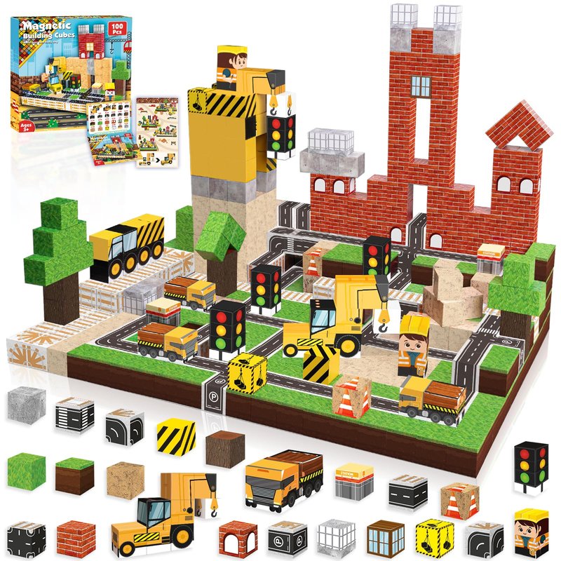 - 【Abundance of Gaming Elements】Including 100 magnet cubes in 30 colors, Kids can build scenes like construction sites, station rescues, and road missions. This magnet toy set contains rich elements such as cranes, engineering vehicles, roads, trains, rails, stations, traffic lights, and magnetic cubes for kids.With endless possibilities, this set sparks imagination and is perfect for magnetic blocks for kids ages 4-8 and older, making play both educational and fun.