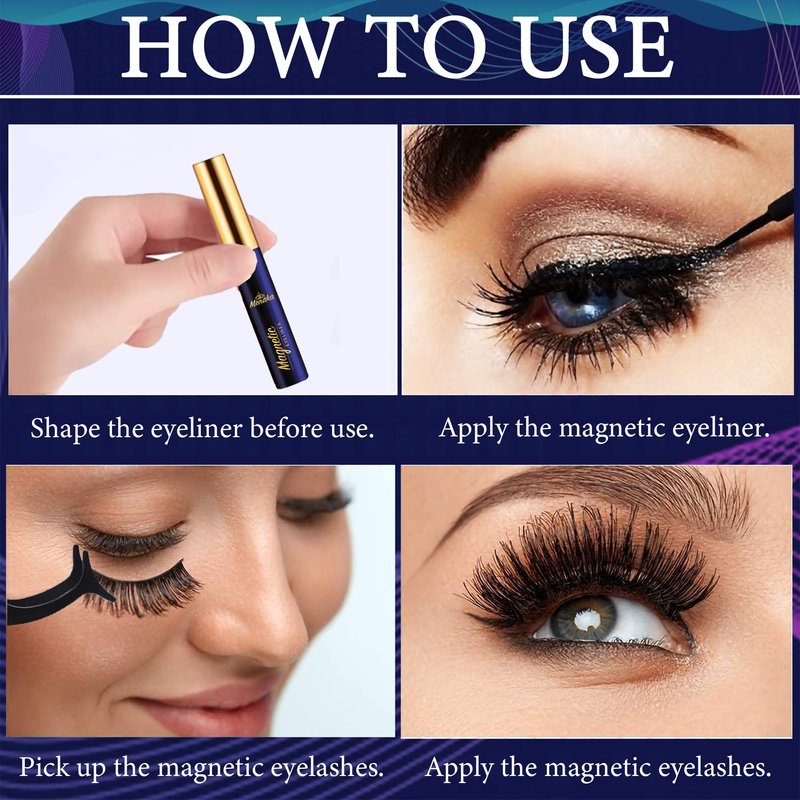 - 【EASY TO USE】No special skills or makeup artist needed. First, shake the eyeliner before use. Apply the magnetic eyeliner as you would with any other liquid eyeliner. Wait for 2-3 minutes, it will become sticky and then stick the magnetic eyelashes to the eyeliner.