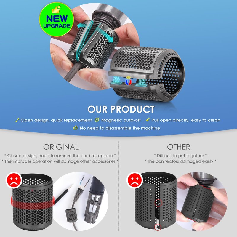 - [New Upgrade] The new upgraded magnetic hair dryer filter, which not only adopts the opening design, but also the magnetic design. It is easier to install and more reliable to use than the original sealed design. The hair dryer filter is made of high quality ABS material with strong hardness and toughness.