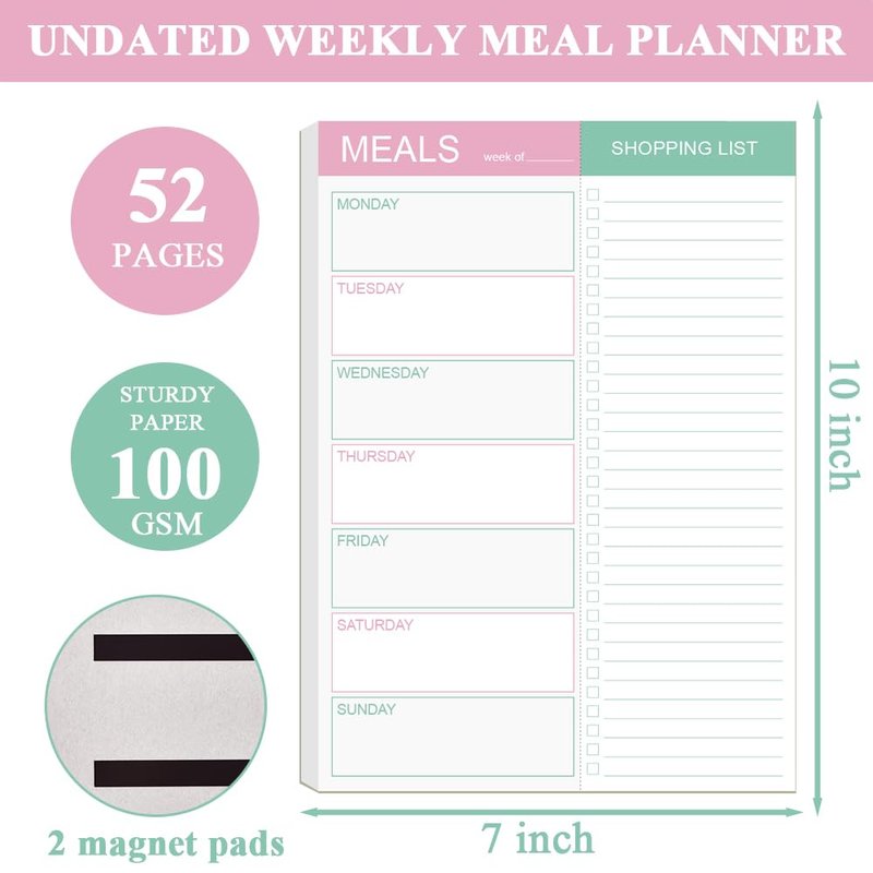This meal planner notepad size of 10" x 7", 52 sheets meal planner for a full year, meal planning a breeze with a meal planning planner. Plan ahead for the meals you'll prepare each day of the week so you can eat healthier, save time on grocery shopping and save money on takeaways and food waste. A perforation has been added to the notepad so that you can quickly and easily tear off your shopping list. With such a handy list, you'll be able to smoothly jot down all the ingredients you need to execute your meal plan or meal prep list! 100gsm white premium acid-free paper for meal planner pad. You can write smoothly and smoothly, and prevent ink leakage, with a solid 900gsm card backing.