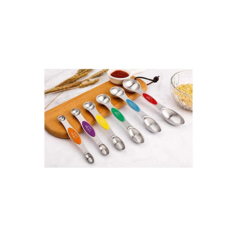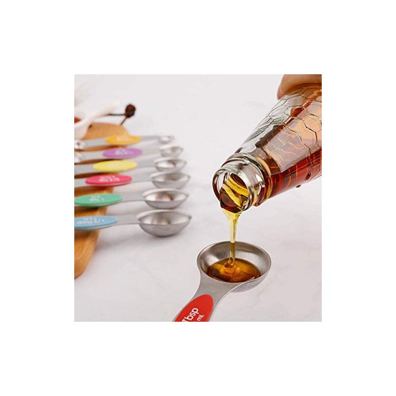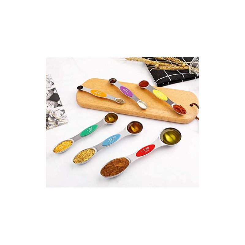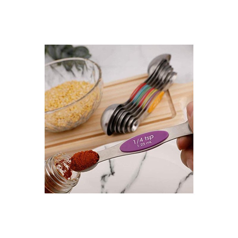 - 【DOUBLE SIDED MEASURING SPOONS 】-The measuring spoons double ended design makes it compatible for measuring the dry and liquid Ingredients,round end measuring liquid ingredient , narrow oval end can fit in most spice jars or bottles. Measuring spoons flat on the bottom and they don't spill.