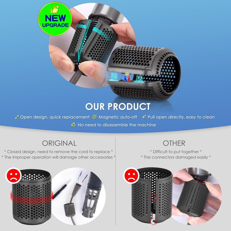 - [New Upgrade] The new upgraded magnetic hair dryer filter, which not only adopts the opening design, but also the magnetic design. It is easier to install and more reliable to use than the original sealed design. The hair dryer filter is made of high quality ABS material with strong hardness and toughness.