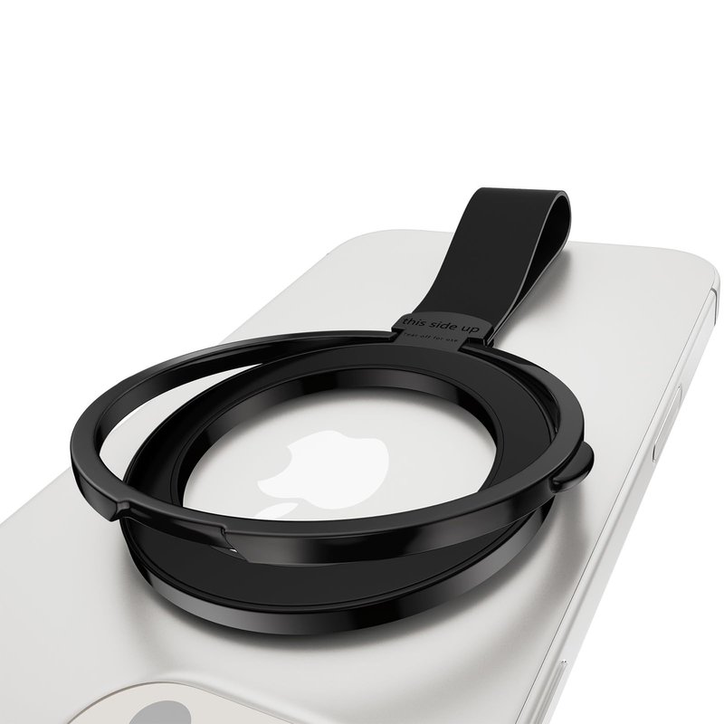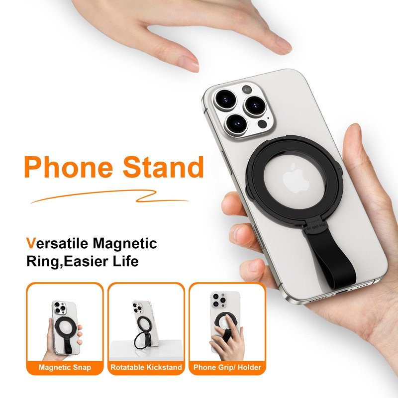 The ring holder features powerful magnets that securely attach to the back of your iPhone 16, 15, 14, 13, and 12 series devices (Note: Please operate without a case or with a MagSafe case).
