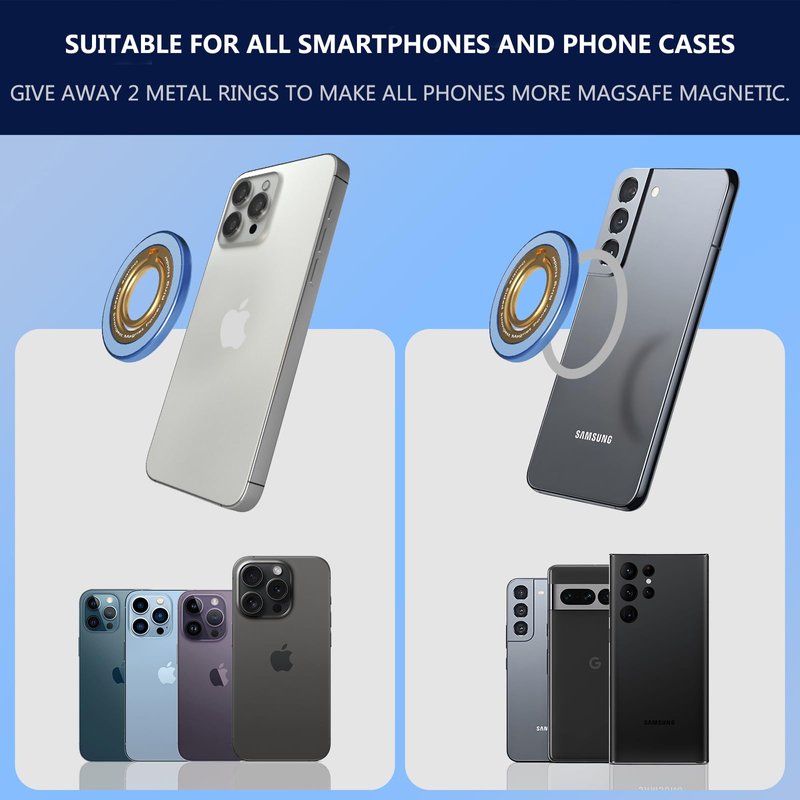 - 【All phone models Compatibility】All models are OK! Very suitable for iPhone 16/15/14/13/12, MagSafe case, magnetic case. Smartphones before iPhone 12 and Android smartphones can also use MagSafe rings if attached with magnetic enhanced metal rings. Models that do not support Magsafe can be easily used on Android smartphones such as Samsung Galaxy, LG, Sony Xperia, etc. by attaching the attached magnetic enhanced metal ring.