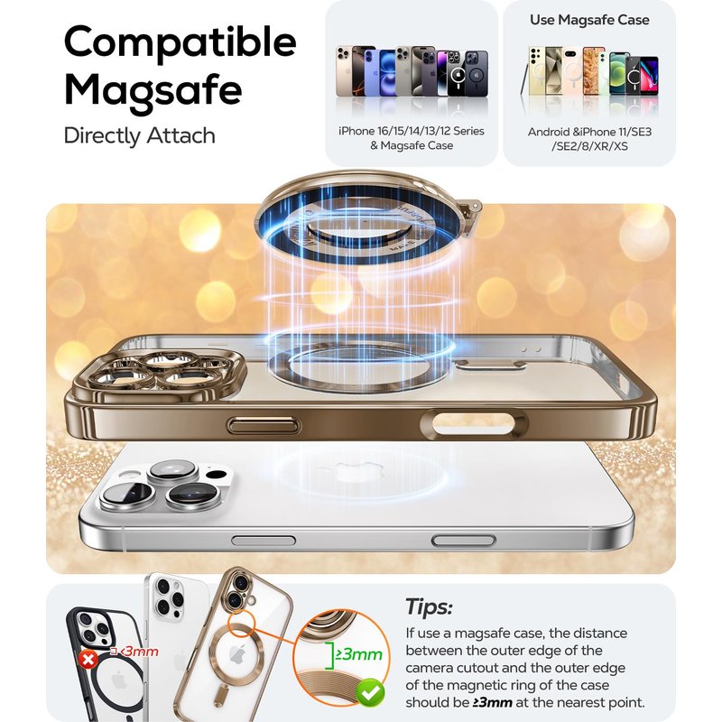 - Compatible with MagSafe: This MagSafe ring stand is designed specifically for use with MagSafe devices and certified MagSafe cases, including iPhone 16/15/14/13/12 Series. For non-MagSafe devices, please use a magsafe case:iPhone 11/11Pro/X/XS/XS Max/8/7, Samsung Galaxy, Google Pixel, etc. (Note:iPhone 16 Pro/ 15 Pro/ 14 Pro/ 13 Pro/ 13 mini/12 mini, can be used with the phone ring holder directly. If wearing a magnetic case, the distance between the magnetic ring and the camera should be≦3mm)