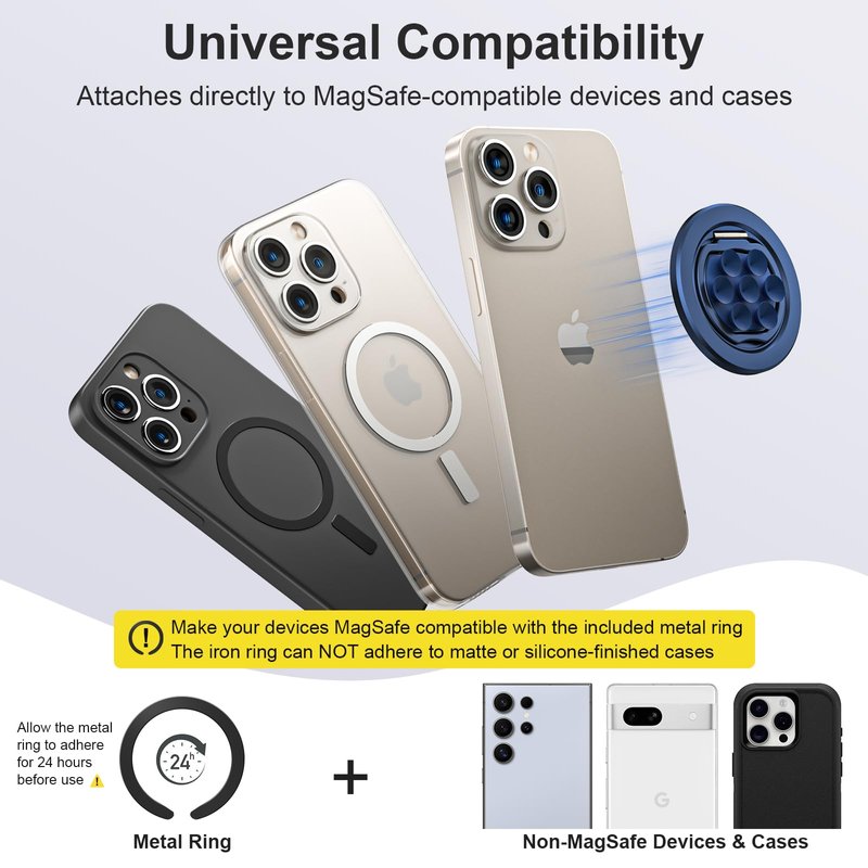 - [Wide Compatibility]- Designed to snap directly onto iPhone 16 Pro Max/Pro/Plus/iPhone 16/iPhone 15 Pro Max/Pro/Plus/iPhone 15/iPhone 14 Pro Max/Pro/Plus/iPhone 14/iPhone 13 Pro Max/Pro/Plus/mini/iPhone 13/iPhone 12 Pro max/Pro/Plus/mini/iPhone 12 series and Mag-Safe-compatible cases. An included iron ring ensures compatibility with non-magnetic cases or devices without MagSafe. Please note: The iron ring may not adhere to matte or silicone-finished cases