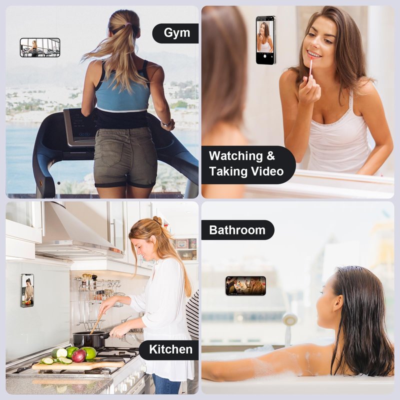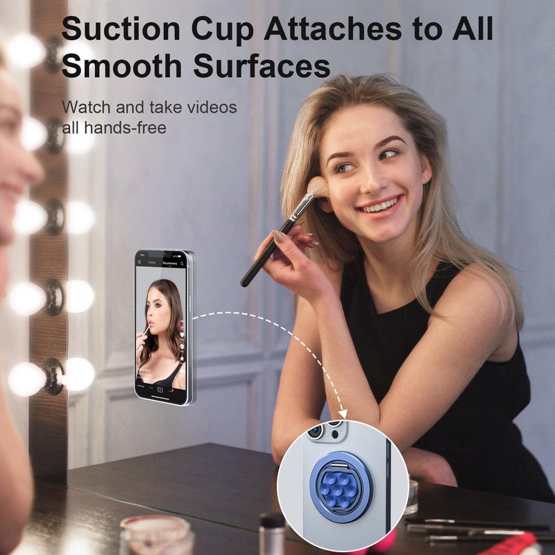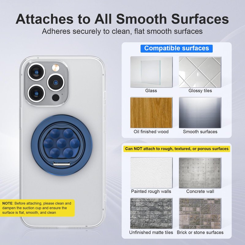 - [Unleash Your Creativity]- Strong suction cups grip on mirrors, windows, and any smooth surface for steady, hands-free TikTok and Instagram videos. NOTE: This suction cup phone grip is engineered to provide a secure and reliable hold on smooth, non-porous surfaces, it can NOT attach to rough, textured, or porous surfaces. Dampen the attaching surface and the suction cup will increase the adhere time