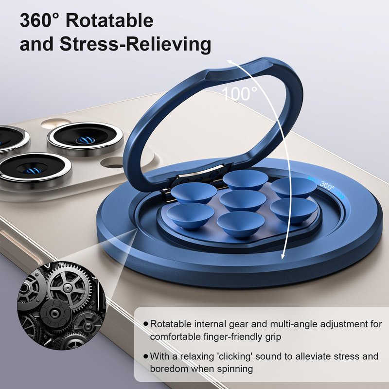 - [360° Rotatable and Stress-Relieving]- The versatile ring grip features rotatable internal gear for smooth 360° rotation and multi-angle adjustment, providing a comfortable, finger-stuck-free grip. When spinning, the rotating mechanism produces a relaxing 'clicking' sound, designed to help alleviate stress and boredom through fidgeting and maximizing fun