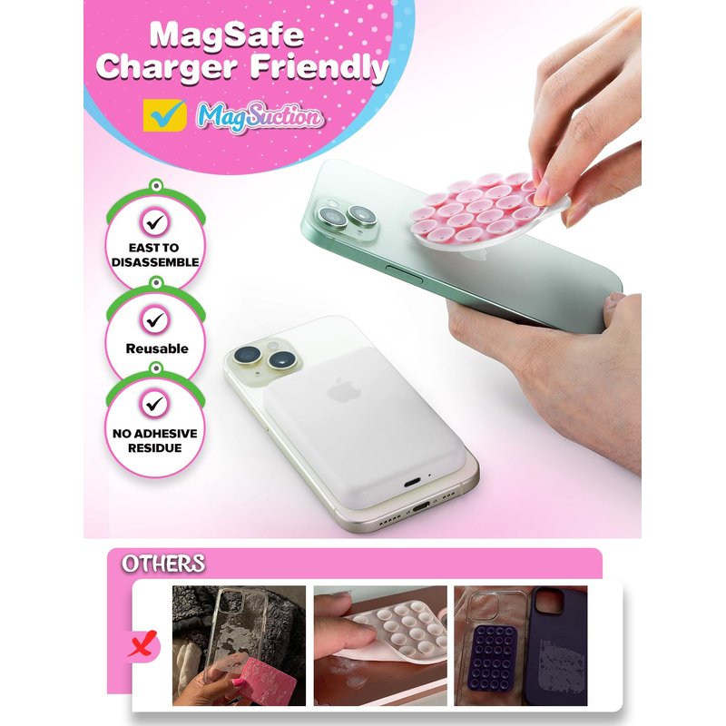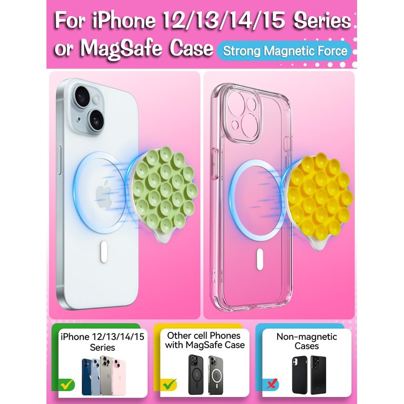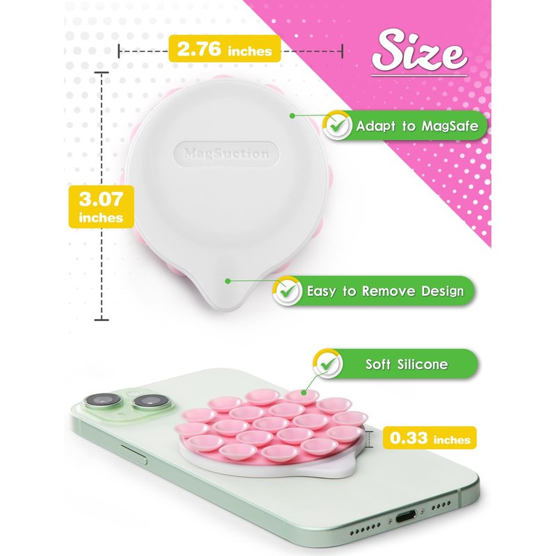 - [Designed for MagSafe] The innovative Cute MagSuction silicone suction cup phone holder is compatible with MagSafe, allowing for quick installation and a strong magnetic grip on any MagSafe-enabled phone or MagSafe phone case. It can be easily detached without leaving unsightly adhesive residue, making it reusable!