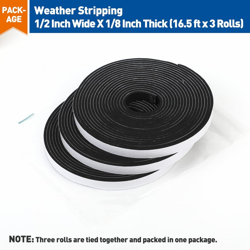 - SIZE OF THIS FOAM TAPE - 1/2 inch W x 1/8 inch T x 16.5 ft L x 3 rolls. You can cut the single-sided door weather stripping into any length you need by using a blade.