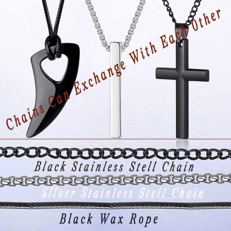 - [Men's Necklaces Set]: Our mens/boy necklaces jewelry necklace set includes 8 pcs pendant necklaces, including 2 black cross necklaces, 2 silver cross necklaces, an arrowhead necklace, a wolf tooth necklace, a bar necklace, and a tag necklace.