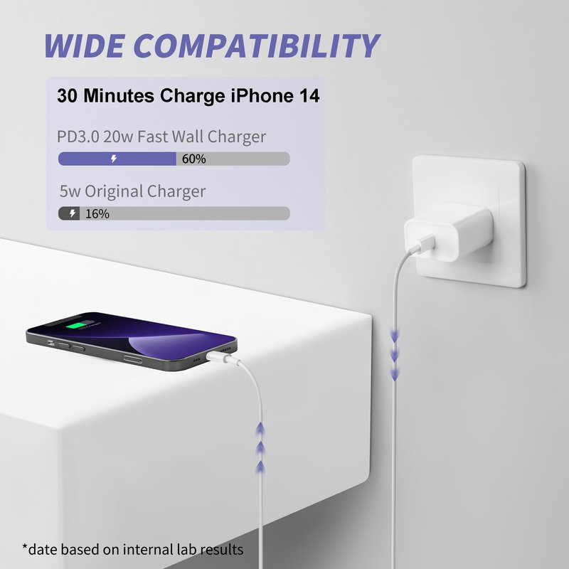 - 3X iPhone Fast Charger : PD 3.0 20W USB-C charger with 6ft type c to lightning cord, charges iPhone 11 12 13 14 up to 60% in just 30 minutes, which saves more than 1 hour for you, when compared to the 5W original charger.