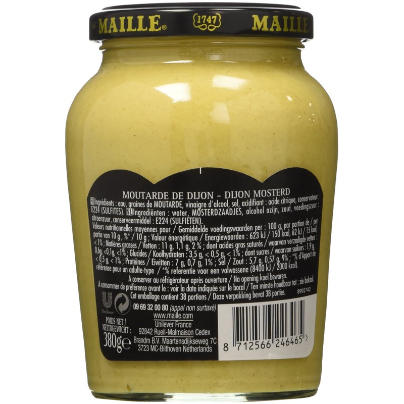 Traditional Dijon Mustard. Dijon Originale. Ingredients: water, mustard seeds, vinegar, salt, citric acid, sulphur dioxide (preservative) Kosher (Pareve - MK 270) Product of Canada. MFG for Maille 21000 Dijon - France.