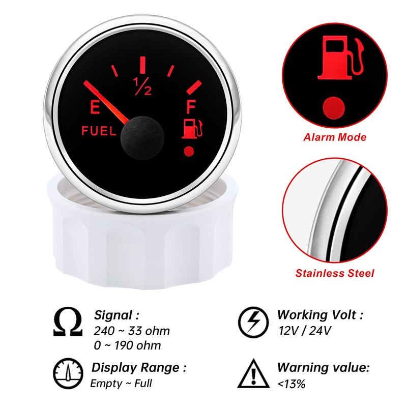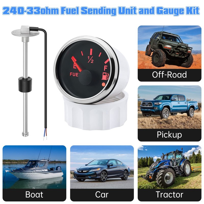 - 🚗【Wide Application 】the fuel sending unit and gauge kit is compatible with Standard American Output, 240 ohm - 33 ohm (Empty - Full), 18-21mm Per Step. It available for use in a boat, marine, automobile, motorcycle, RV, or yacht. It is suitable for fuel, kerosene, water, chemical tanks and any kinds of liquids without impurities.