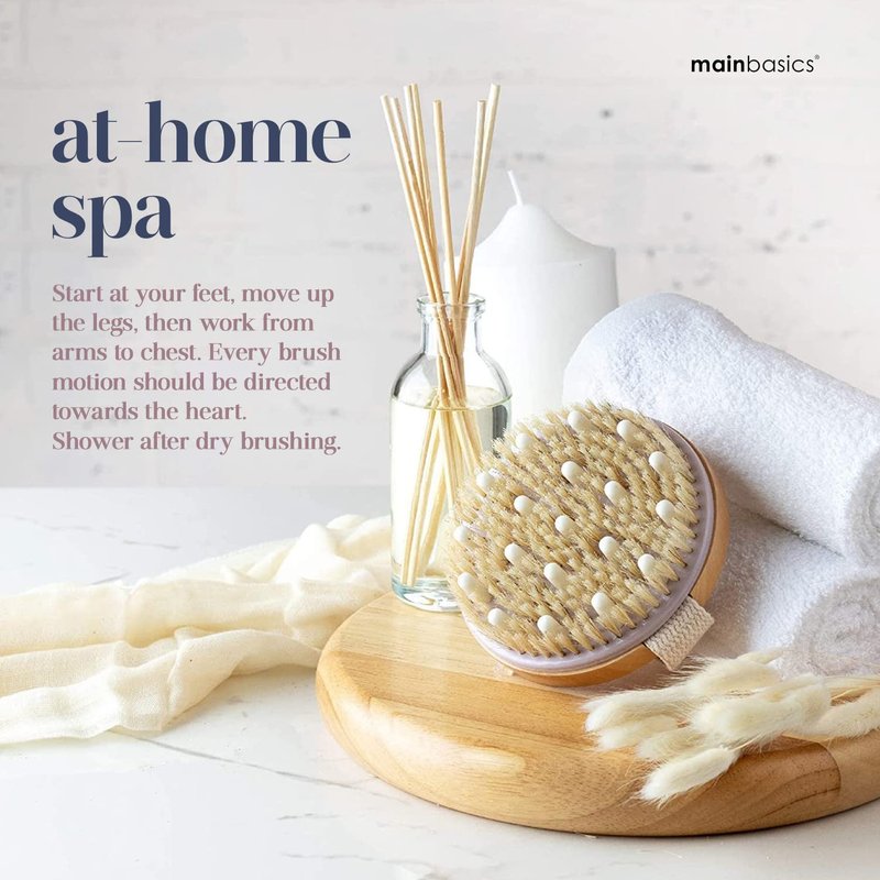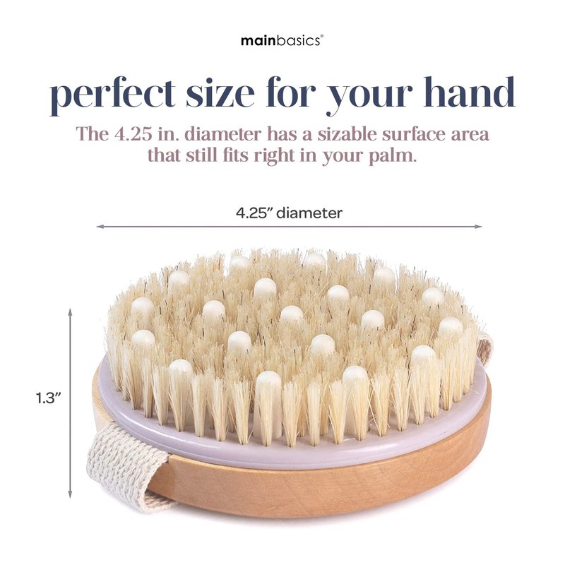 At MainBasics, we produce quality bath and body products to help bring out your beauty, shine, and confidence. When dead cells start to build up on the surface of your skin, it starts to appear ashen. But dead skin affects more than appearance. It can actually act as a barrier, keeping your skin-care products from sinking in. Exfoliate skin to excellence with your dry skin brush by MainBasics. It helps your lotions deliver much-needed nutrients deep into your dermis by bringing down that barrier. Skin becomes more supple, soft, and smooth with every swipe. When it comes to exfoliation, it’s easy to overdo it. Many people press too hard, making micro-cuts that damage, rather than dispel, dry skin. Prevent over-exfoliation with your round, exfoliating body brush. Its rubber nodules block you from applying too much pressure, protecting your skin swipe after swipe. Too much exfoliation can actually aggravate certain skin conditions, such as eczema and psoriasis. But as long as you have healthy skin, you’re in the clear to scrub with the body brush. Like every loofah or face scrubber, it’s only a matter of time until your cellulite massager brush needs replacing. To experience excellent exfoliation every time, remember to replace your body massager brush every 6-12 months, depending how often you exfoliate. Bring the spa experience home with our the MainBasics Round Dry Body Brush with Nodules. Featuring natural bristles and soft rubber massager, it helps relieve stress and muscle tension, and gives a natural energy boost. Dry brushing improves skin health by unclogging pores, improving circulation, and reducing cellulite. Get glowing with the MainBasics dry brush.