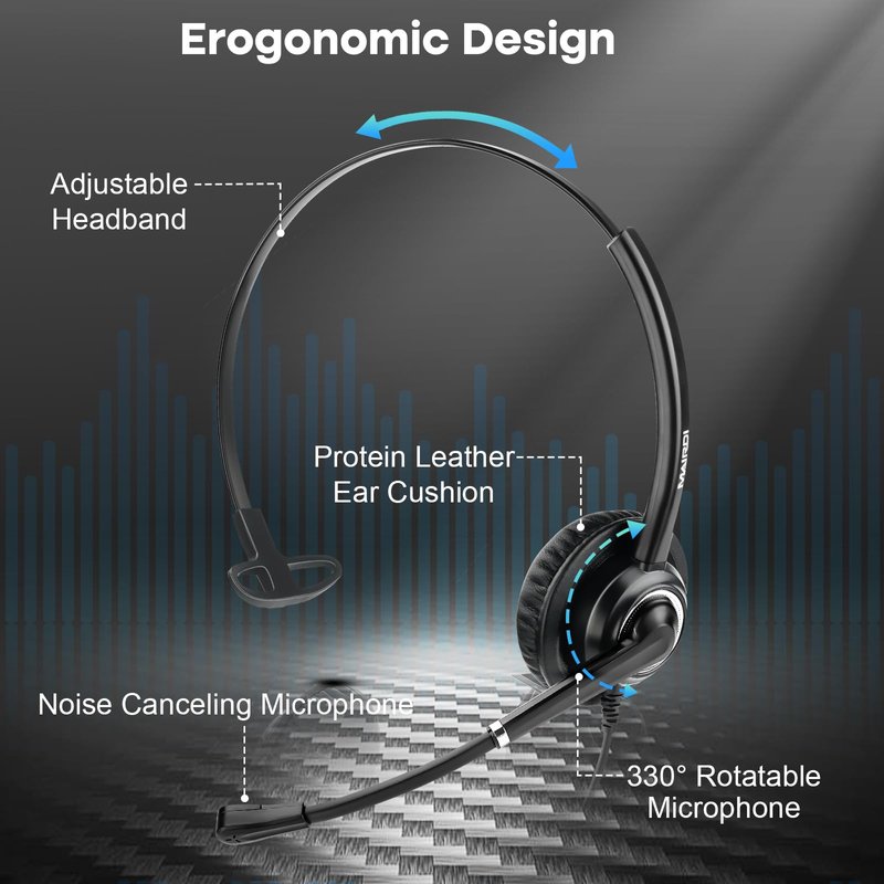 - SUPER COMFOT HEADSET: Call center headset with super soft protein leatherette ear cushion,user-friendly hygiene, adjustable headband ensure fit for different head sizes. Ear cover is 180 rotatable, no pain no push to ears for all day long wearing. Monaural RJ9 phone jack headset with noise canceling microphone boom 330 degree rotatable for wearing mic on either side, a super communication headset for telemarketing and offices.