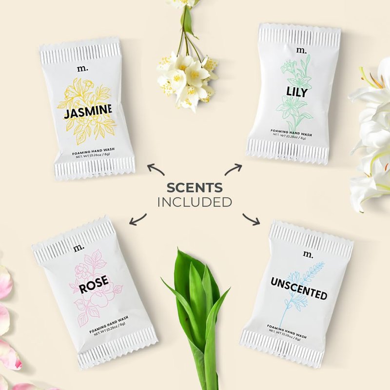 - THIS PACK INCLUDES: 4 pack MIX foaming hand soap refill tablets inlucing JASMINE, ROSE, LILY and UNSCENTED. Each hand soap foam refill tablet lasts 6 to 8 weeks on average.
