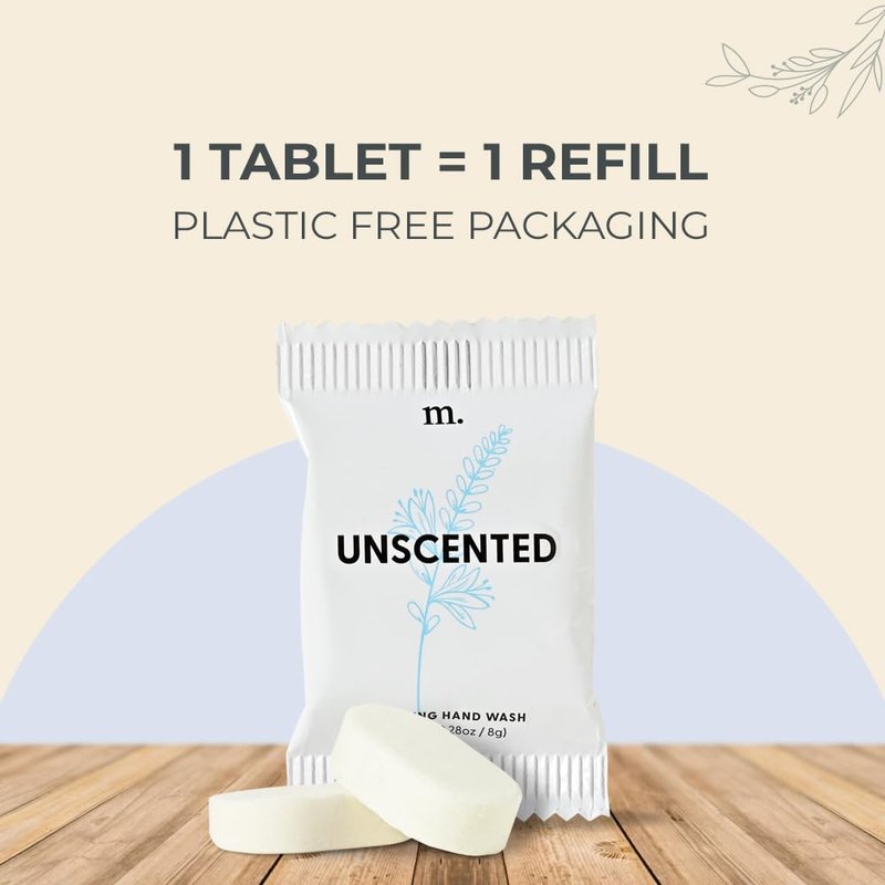 - THIS PACK INCLUDES: 4 pack UNSCENTED foaming hand soap refill tablets. Also comes in JASMINE, ROSE and LILY; check our store for more. Each hand soap foam refill tablet lasts 6 to 8 weeks on average.