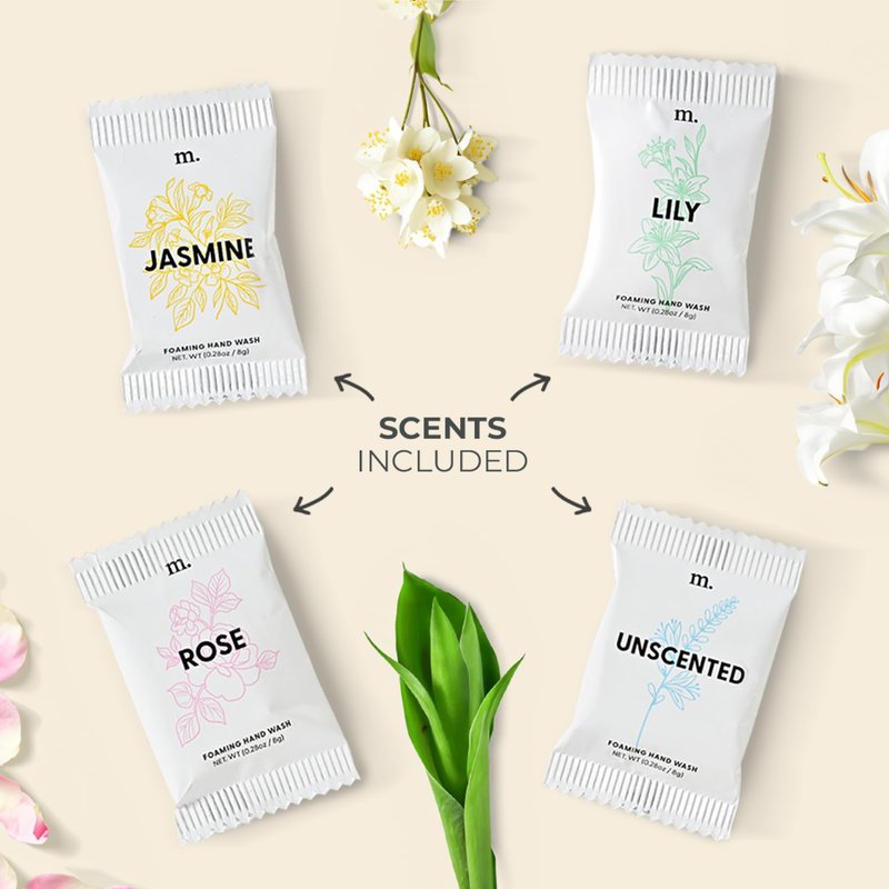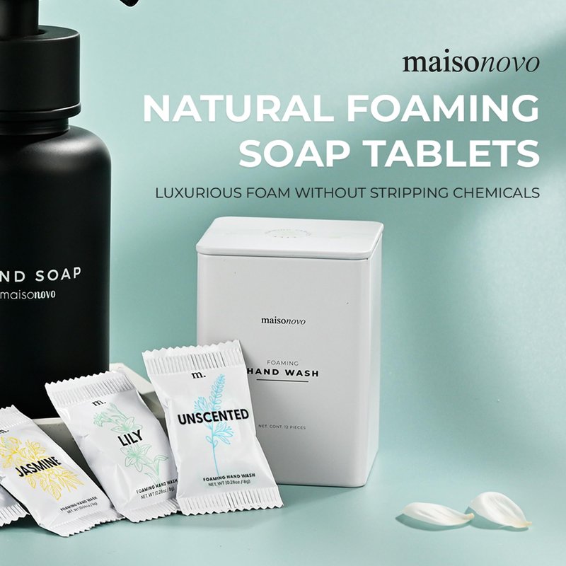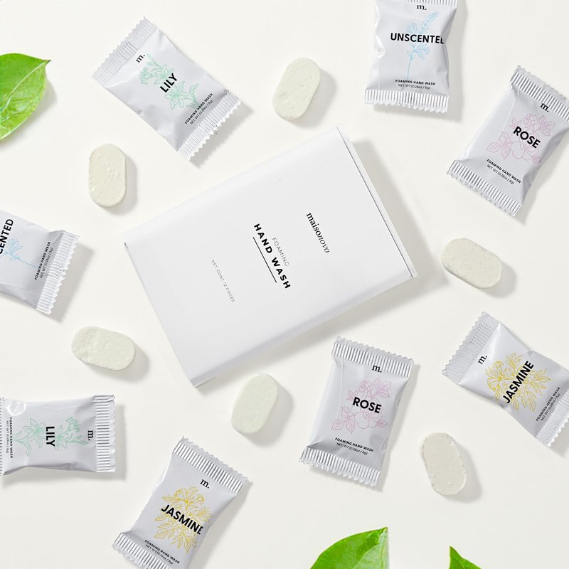 - THIS PACK INCLUDES: 12 pack MIX foaming hand soap refill tablets inlucing JASMINE, ROSE, LILY and UNSCENTED. Each hand soap foam refill tablet lasts 6 to 8 weeks on average.