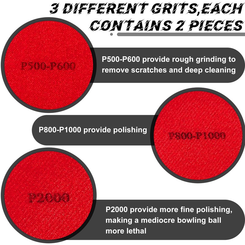 - Abundant quantity and suitable size: 6 pieces bowling ball sanding pads in 3 kinds of grits, P2000, P3000, P5000D, 2 pieces each grit; Each bowling ball sanding pad measures about 5 inch in diameter, adequate for your daily life; Note: to avoid scratch marks caused by friction during the long-distance transportation, we put the sanding side face to face while manufacturing them; Please gently tear a small opening along the side and then slowly separate the two sanding pads.