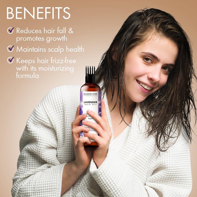 - Helps Reduce Hairfall: Majestic Pure Lavender Hair Oil is infused with Vitamin E & Argan Oils that are known to help reduce hair fall by making your strands stronger. With the addition of lavender, this scented hair oil also leaves behind a petal-fresh fragrance to keep your hair smelling heavenly.