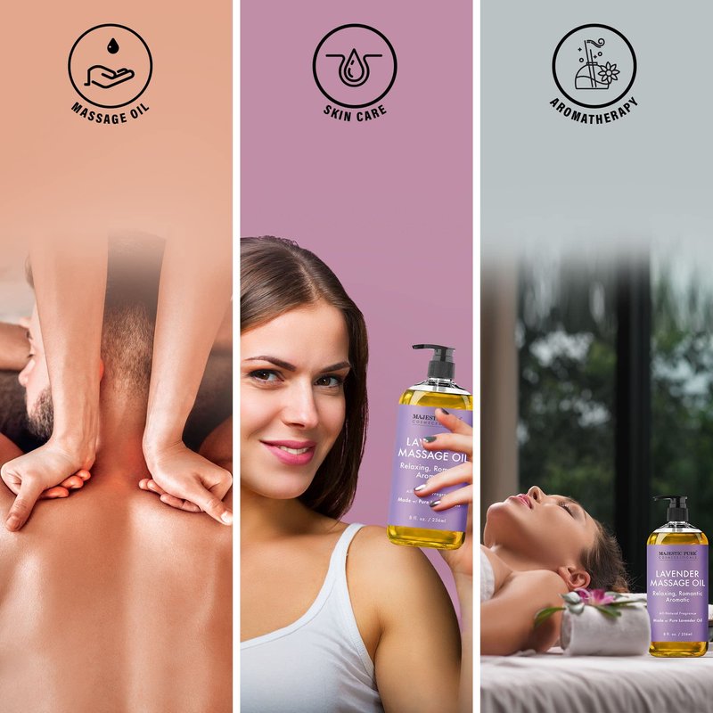 - Majestic Pure Lavender Massage Oil harnesses the calming properties of Lavender, Orange Peel & Frankincense to soothe the mind and promote relaxation, while contributing to skin hydration and bright complexion.