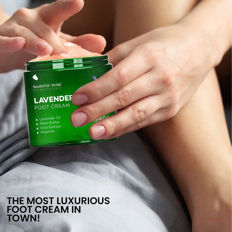 - premiumFoot Cream – Majestic Pure Lavender Oil Warming Foot Cream is formulated with skin loving ingredients such as Lavender Oil, Peppermint Oil, and Shea Butter to soften and moisturize dry rough skin. It contains No Harmful Chemicals and can be used by Men & Women