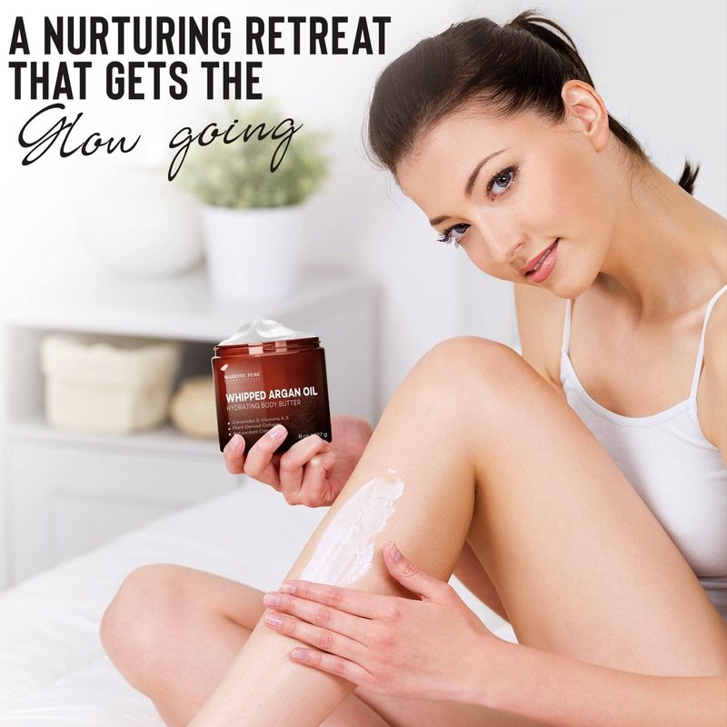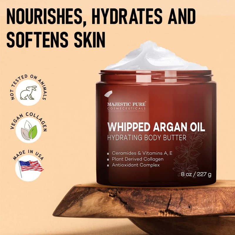 - Moisturizing Whipped Body Butter – Majestic Pure Whipped Argan Oil Body Butter with Infused with Ceramides, Vitamin E & A, Vegan Collagen, & Antioxidant Complex, for all skin types, Men & Women. Made in USA