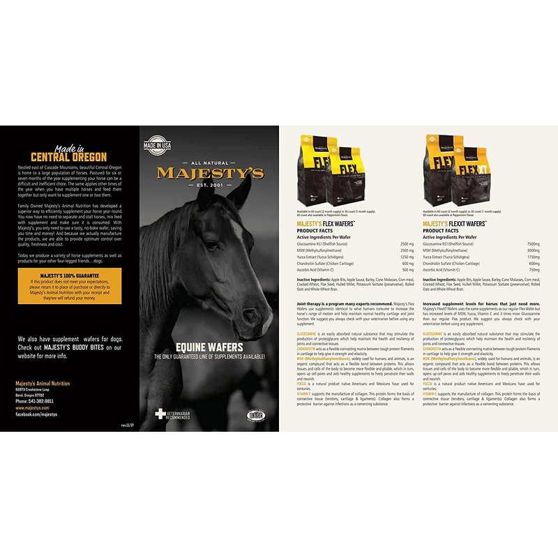 - Contains one (1) bag of Majesty's Peppermint Flex Wafers Superior Performance Horse / Equine Joint Support Supplement. Flex Wafers have combined five superior support supplements to produce an easy-to-use supplement wafer that increases range of motion and reduces inflammation