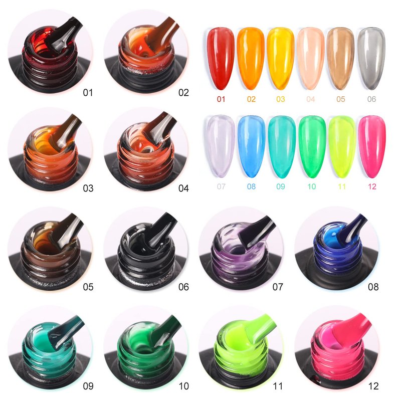 - 12 colors 8 ML jelly nail polish set: Jelly gel nail polish is a popular nail trend that gives your nails a glassy, see through appearance effect similar to jelly.The jelly nail polish color different from ordinary gel nail polish.It is a semitransparent nail gel. One layer, two layers and three layers are different effect