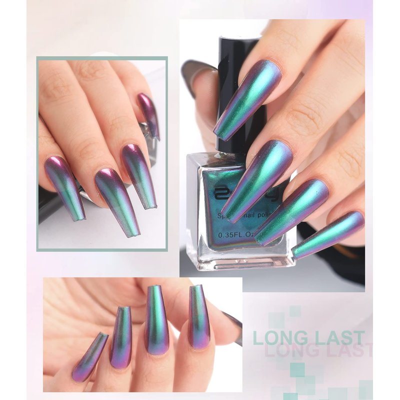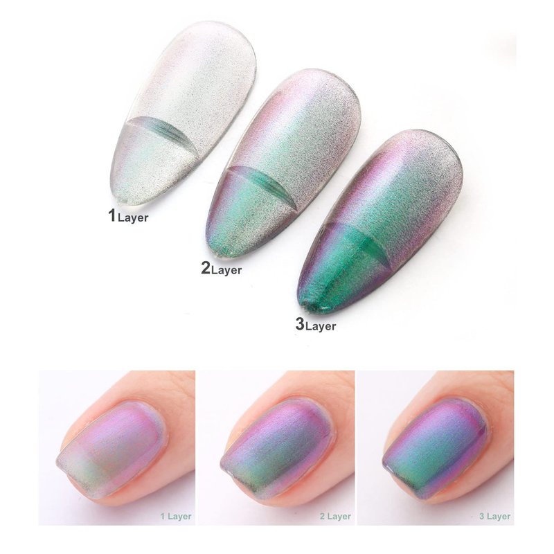 - Package Contents:1 Bottle 10ml chameleon chrome nail polish. Different base colors will show different effects.One layer, two layers and three layers are different effect.Don't need UV lamp and other complicated tools, you can achieve beautiful manicure at home easily.