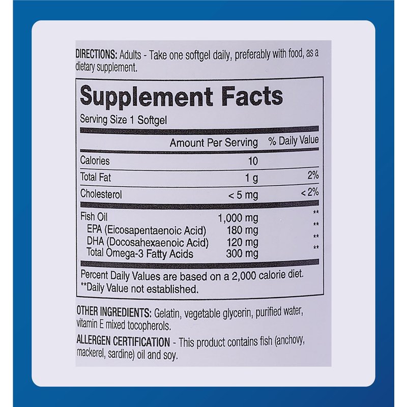 The Major Omega-3 Fish Oil Supplement is a 1,000 mg softgel formula that can be taken once daily as part of a dietary supplement. It is recommended that these softgels be taken with food. Each serving provides 300 mg of EPA and DHA omega-3 fatty acids. If you are pregnant, nursing, taking any medications, or have any medical condition, consult your physician before use. Discontinue use and consult your physician if any adverse reactions occur.