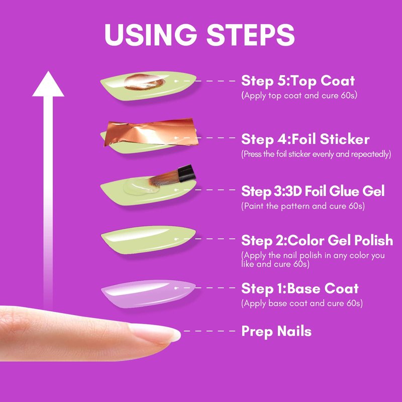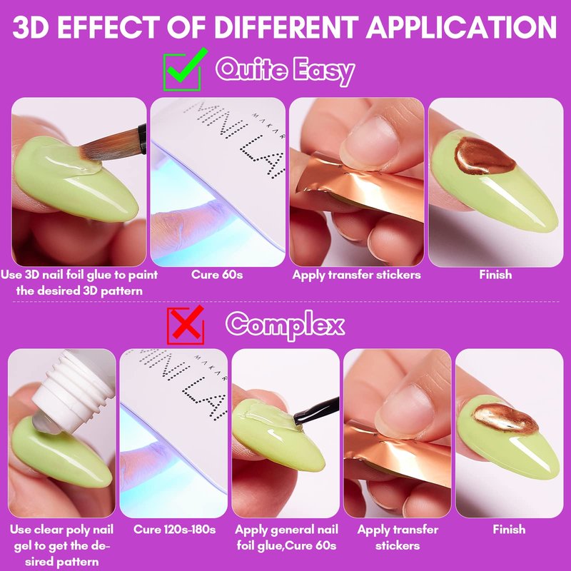 - Easy to Use: After filing the nail surface,you can apply 3D nail transfer foil and design the desired shape, and cure 60s under UV lamp, then press the nail foil stickers onto it. Also you can use with nail polish, nail extension gel, dip powder and acrylic powder to get your unique nail art.