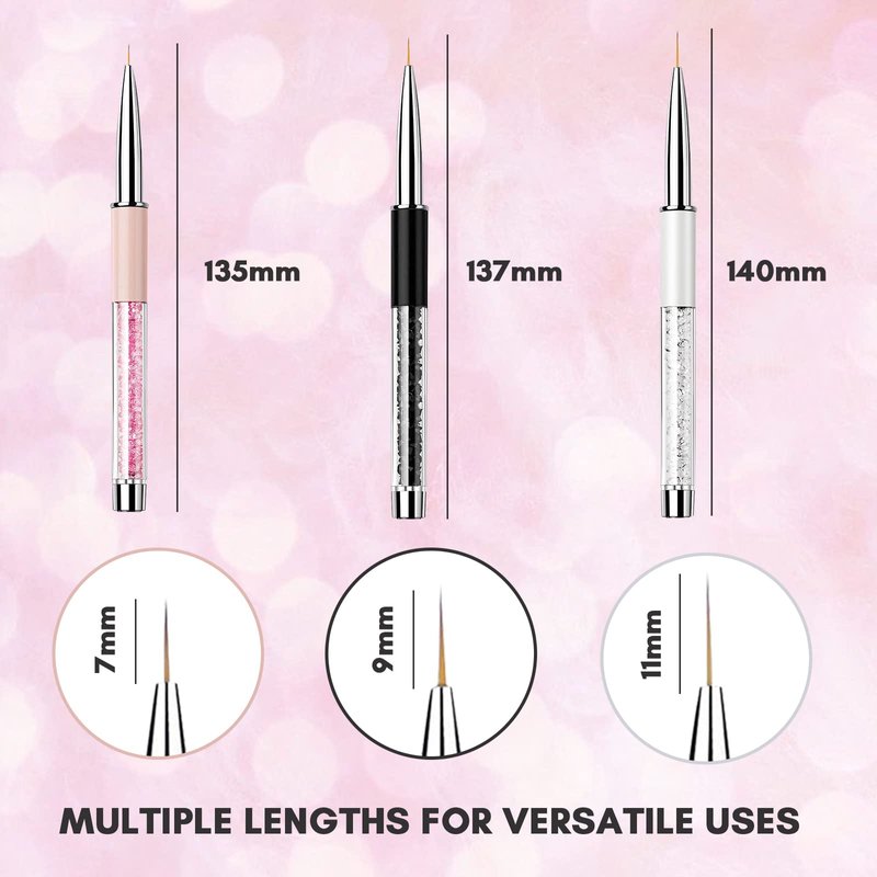 - IDEAL FOR NAIL ART DRAWING- These nail detail brush sets come with 3pcs nail liner brush pens with different sizes 7mm/0.28 in, 9mm/0.35 in, 11mm/0.43 in. Ideal for drawing lines, hearts, stars, moons, and spider webs and creating smile lines for the tip of French nails, and ombre nails, making your nails more elegant and charming.