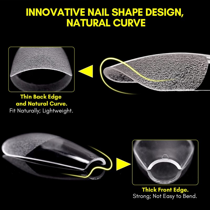 - 【High Quality Soft Gel Nail Tips】 - Made with high-quality soak-off PMMA material that's more malleable and leave no trace while folding,cuting, filing or shaping;the ultra thin back edge and the natural curve make them comfortable to wear and fit the nail bed naturally; perfect for press on nails DIY and nail tips extension.