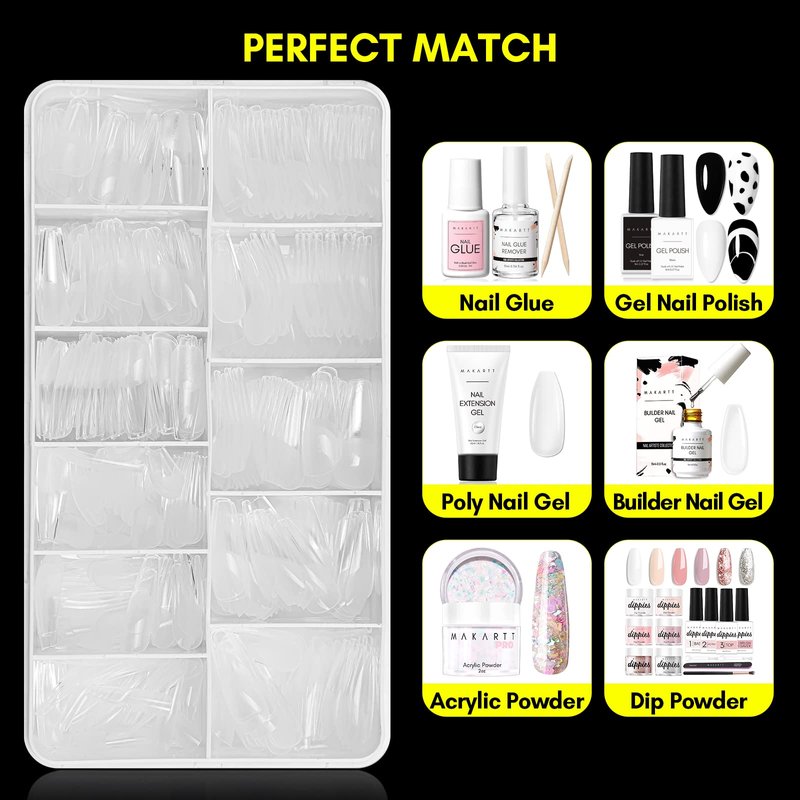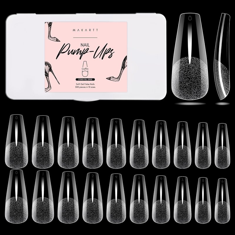 Makartt Coffin Nail Tips 500pcs Long Pre-buffed Full Cover Clear Press on Nails 10 Sizes Soak Off Soft Gel Nail Tips Extension Professional Acrylic Fake Nails No Crease False Nail Salon DIY Nail Art