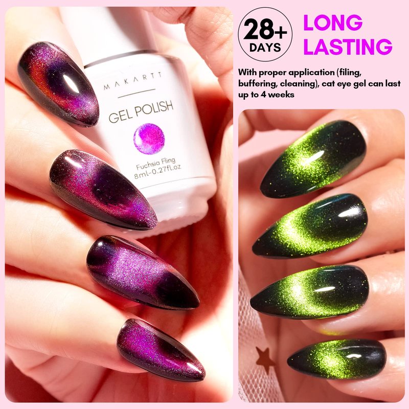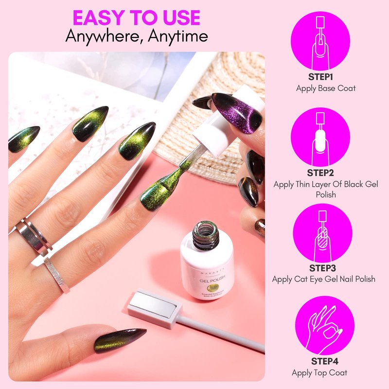 - 【Different Cat Eye Effect】: The cateye gel polish has a distinctive design that creates a mesmerizing gem nail polish set with classic black gel polish. The gel polish contains magnetic particles that react to different magnetic sticks, creating different 9D cat-eye effects on the nail. Makartt only provides one piece of magnetic stick.