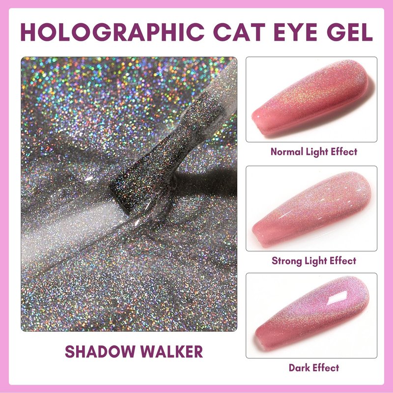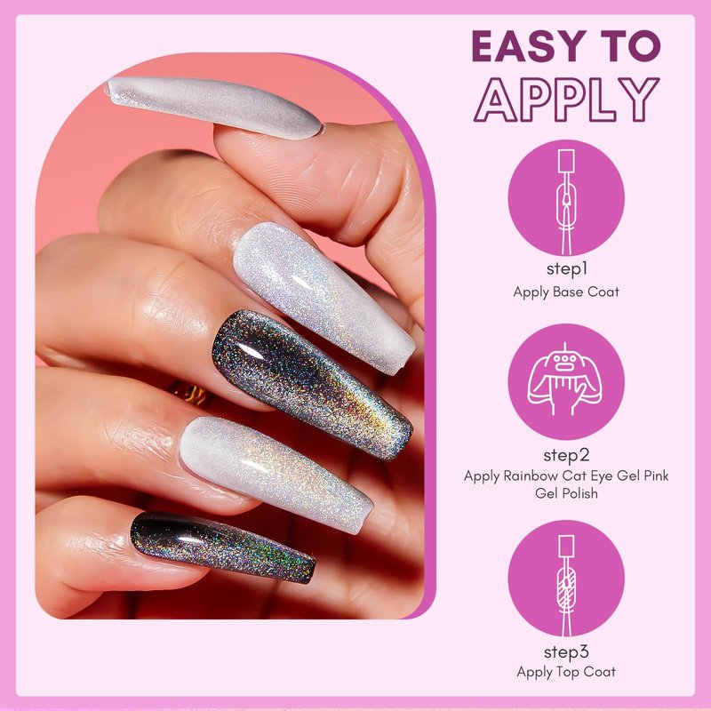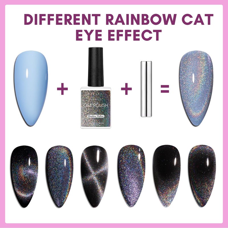 - 【Overlay Different Base Colors】: The rainbow holographic 9D cat eye gel polish has a distinctive design that creates a mesmerizing gem nail polish set with different colors of gel polish.Such as blue pink yellow and so on. In fall, you can pair it with nude nail polish, and in winter, you can pair it with brown gel polish. The charming color changing and cat's eye effect will surprise you.