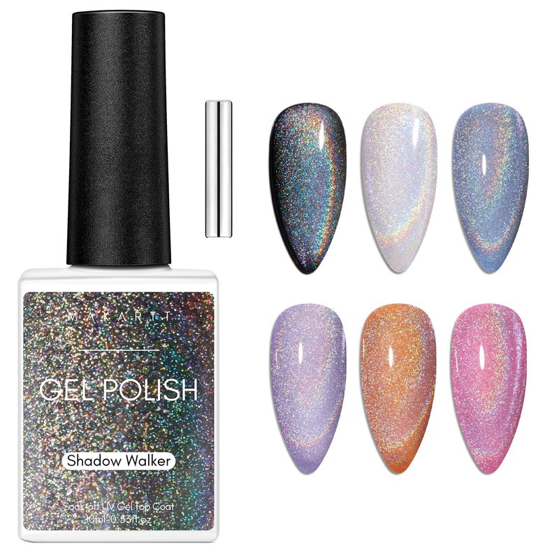 Makartt Gel Nail Polish, Universal Rainbow Cat Eye Gel Nail Polish 10ml Holographic 9D Sparkly Hole Cat Eye Glitter Spring Gel Polish with Magnet Stick Soak Off UV/LED Manicure Nail Art Designs