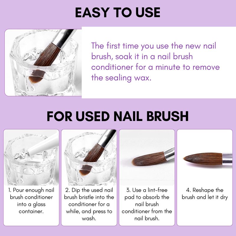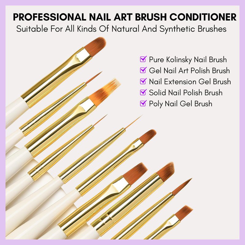 - 【Wide Range of Uses】: The professional acrylic brush cleaner conditioner for cleaning restoring and caring for all kinds of nail art brushes. Such as pure Kolinsky nail brushes, gel nail art polish brushes, nail extension gel brushes, solid nail polish brushes, poly nail gel nail brushes, dip brushes, acrylic brushes, and so on.