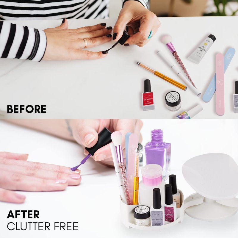 - ✔️Easily Clean With Detachable Design: This nail polish holder stand has a detachable design, if at any time you do not need the tray or nail polish holder they can be disconnected easily from the stand. With 2 washable and removable soft cotton terry-cloths, you can stretch it over the hand/foot rest without worrying about soiling the white nail rest.