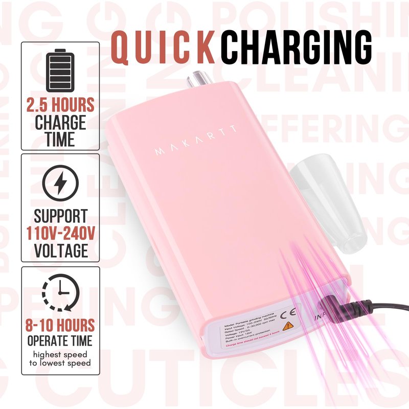 - Quickly Charging: Being charged for about 2.5 hours, the electric nail file lasts 8 hours of operation time. Please note that do not charge the machine over 4 hours.