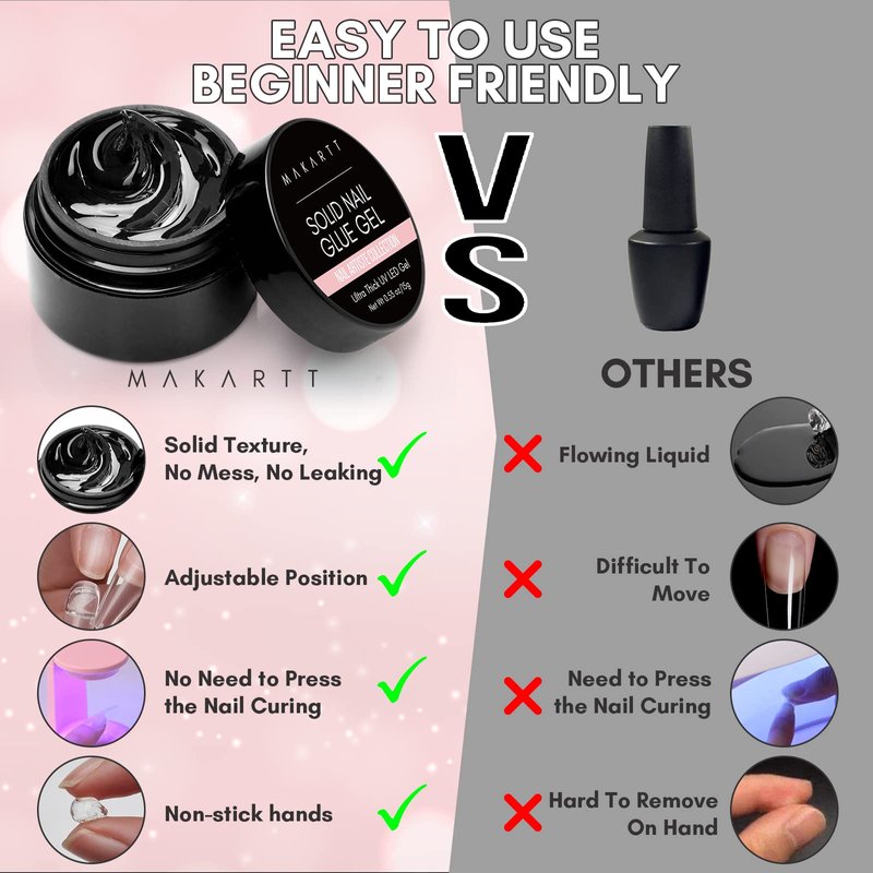 - Long-Lasting & Easy Using - The solid nail glue gel is hard state gel and the texture looks like rubber, don't harm your nails, does not flow, don't stick to hands, and uv nail adhesive gel, repositionable before curing, offers good flexibility and ease of use. But it has stronger adhesion than liquid glue after it was cured under nail lamp, and is easier to operate.a proper operation can bring a beautiful result for at least 2 weeks.