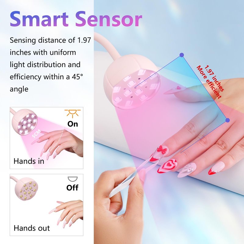 - Smart Sensor with 4 Timer Setting: The nail cure lamp is equipped with an auto infrared sensor. Hand in, light on; Hand out, light off. Offering 45s (default), 10s, 30s, and 60s timing options displayed on the LCD screen, it adapts to different curing needs for various nail styles.