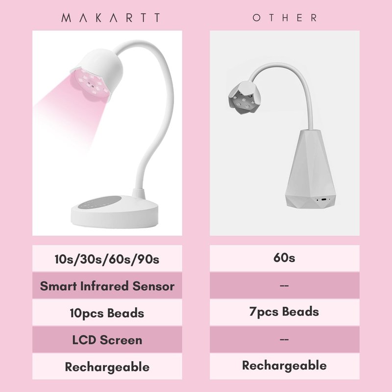 Makartt Touch Switch Nail Lamp-10W Gel Lamp Mini Wireless Nail Lamp for Gel Nail Polish, Rechargeable LED Flash Cure Light Quick Drying Goose Neck 360° Rotation U V Lamp for Nail Salon Features: 1. Smart infrared sensor design: Hands-in, light-on, hands-out, light-off. 2. Clear LCD Screen: Show the battery capacity and timer status clearly, making this UV lamp for nails easy to control. 3. 4 Timer setting: This nail uv light come with 4 timers: 90s(default setting and suto-sensing)/ 60s/ 30s/ 10s. 4. 360° Adjustable Hose: The gel UV-led nail lamp could be adjusted to any angle and direction as needed. 5. Open Curing Space: Perfect for gelly nail tip curing, fast-fixing nail rhinestones, and liner gel polish. Specification: 10pcs Red UV/LED Beads Battery Capacity: 1800mAh Max Power: 10W Wavelength: 365nm- 635nm Timer: 90s/60s/30s/10s