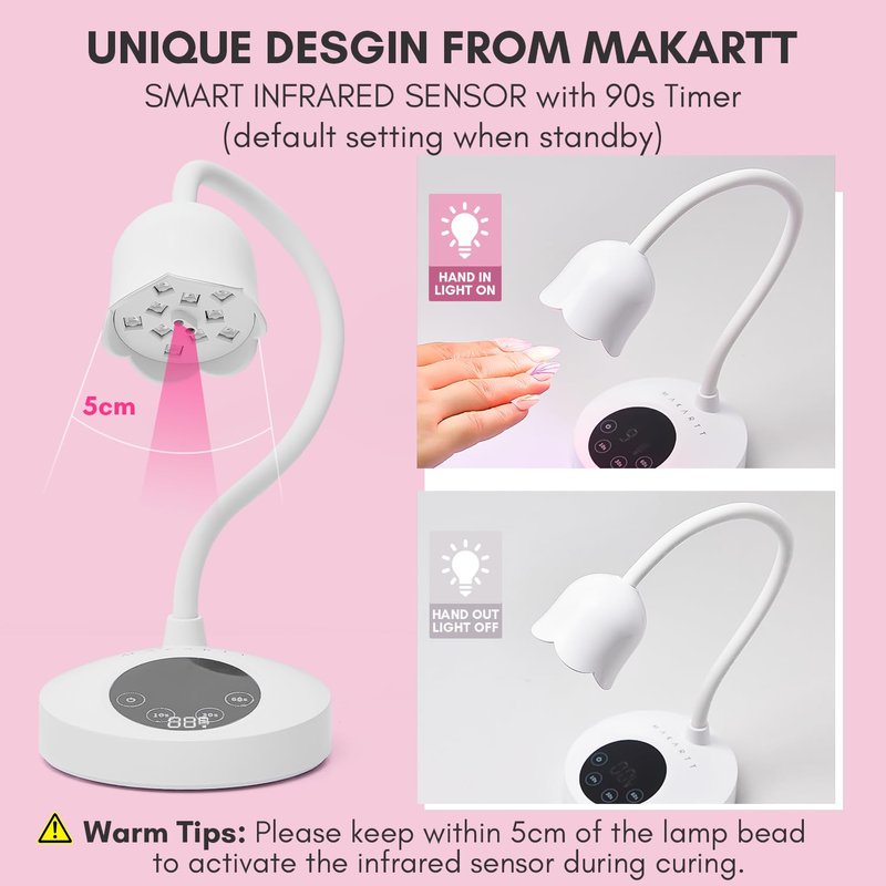 - ✨【Makartt Mini Auto-sensing UV Nail Lamp 】Unique design of the desktop gel UV lamp with a smart infrared sensor, hand-in, light on, and hands-out, light off. Open curing space provides convenience for false nail tip glue curing, quickly fixes nail charms and gel polish drawing, and improves the efficiency of nail art creation. It is a perfect E-nail tool for nail technicians and nail salons.