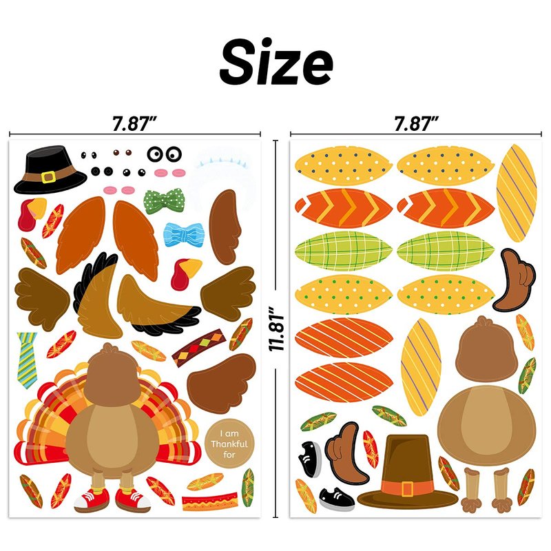 - Package Includes: 20 Make-A-Turkey sticker sheets. 2 designs, 10 of each. All the stickers are repositionable