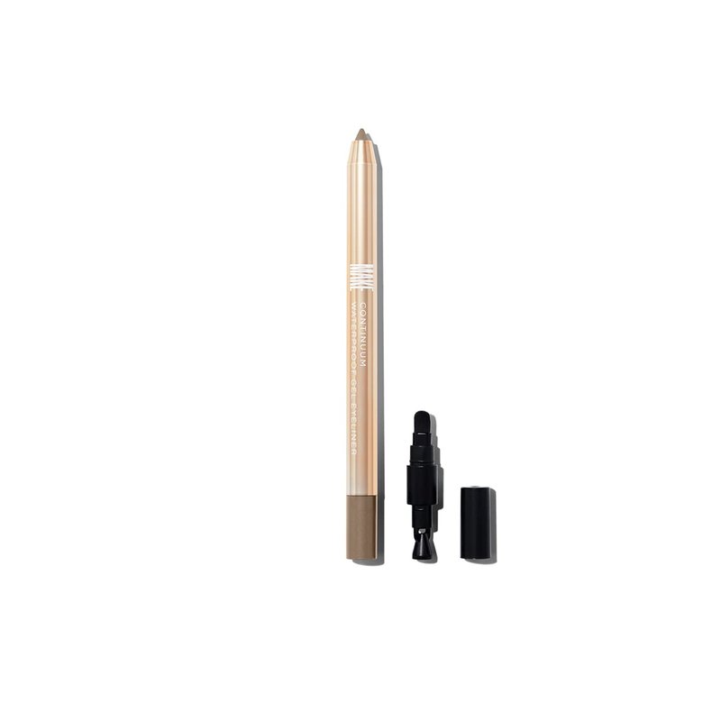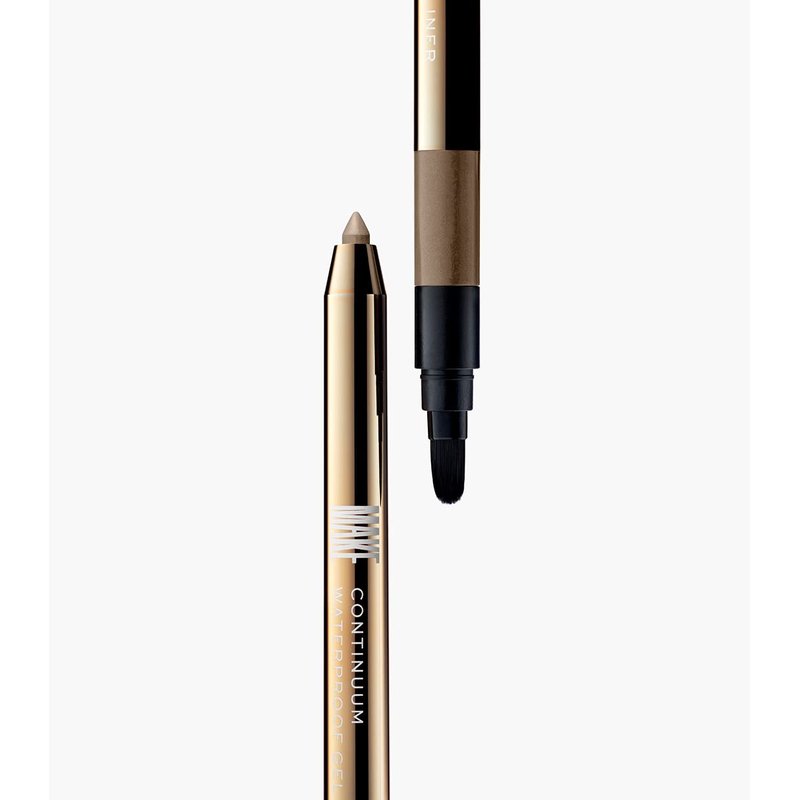 MAKE Continuum waterproof eyeliner is available in 12 shades. This Halo gel liner is a shimmery gold eyeliner pencil. For best results, twist the eyeliner to reveal a small amount of lead and glide along the lash line and water line to define eyes, or blend out for an alluring smoky eye effect.